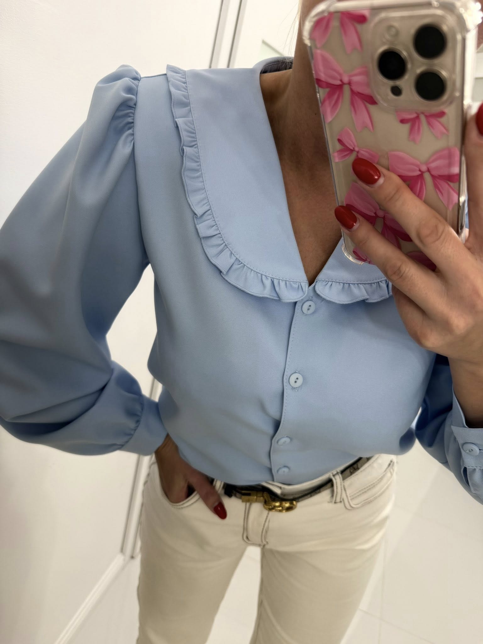 Model wyróżnia się dużym kołnierzem wykończonym falbanką, który nadaje całości lekko romantycznego charakteru. Marszczenia na ramionach subtelnie podkreślają linię sylwetki i dodają koszuli lekkości, zachowując przy tym elegancki balans.